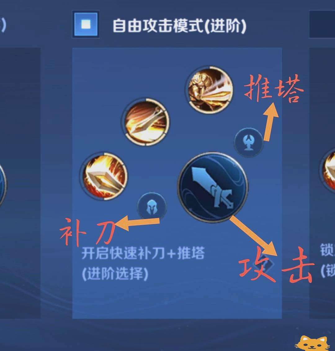 在基礎操作設置中,找到并點擊“自由攻擊模式進階”進行選擇。在游戲中,通過 點擊補刀鍵,您可以實現自動瞄準小兵的功能;同樣,點擊推塔鍵可自動瞄準防御塔;而點擊攻擊鍵,則能自動瞄準敵方英雄。