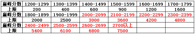 表內黑色為我親測無誤的,標紅的為我網上查的資料,畢竟我巔峰最高就打到1900多分(手動捂臉),再高就沒見過了。