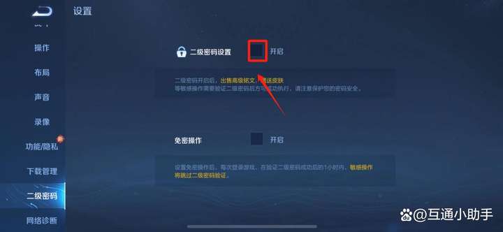 進入游戲設(shè)置 → 選擇「二級密碼」→ 點擊「開啟」→ 輸入自定義密碼(支持?jǐn)?shù)字、字母、符號組合)。