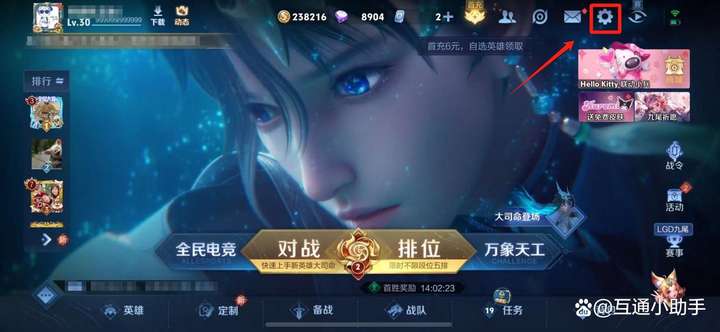 1、進入王者榮耀游戲大廳界面后,點擊“設(shè)置圖標(biāo)”。