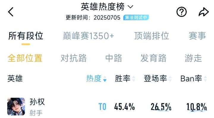 7月5日更新的全英雄段位數據揭曉,新英雄孫權雖然熱度飆升至T0級別,但其在首日的全分段勝率僅為45.4%,頂端排位的勝率更是低至41.5%。盡管如此,孫權的全英雄登場率卻高達26.5%,同時其ban率也達到了10.8%,這一數據充分展現了玩家們對孫權的極高關注度和熱衷程度。