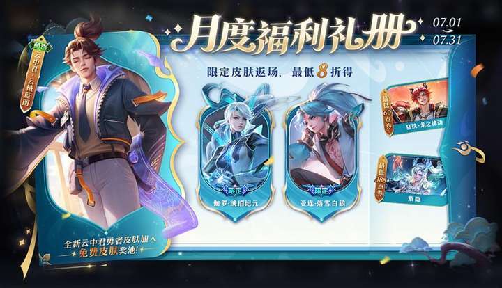 7月月度福利禮冊更新,伽羅-琥珀紀元和亞連-落雪白狼迎來返場,返場時間為7月1日-7月31日之間,最低折扣為8折。
