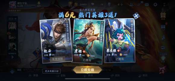 關(guān)于王者英雄趙云的獲得途徑有三種方式,但都離不開對王者游戲的充值。 1.第一種 如果你在王者游戲中還未充值過,那么首頁會有首充選項,首充滿6元,贈送熱門英雄3選1.其中就有趙云。